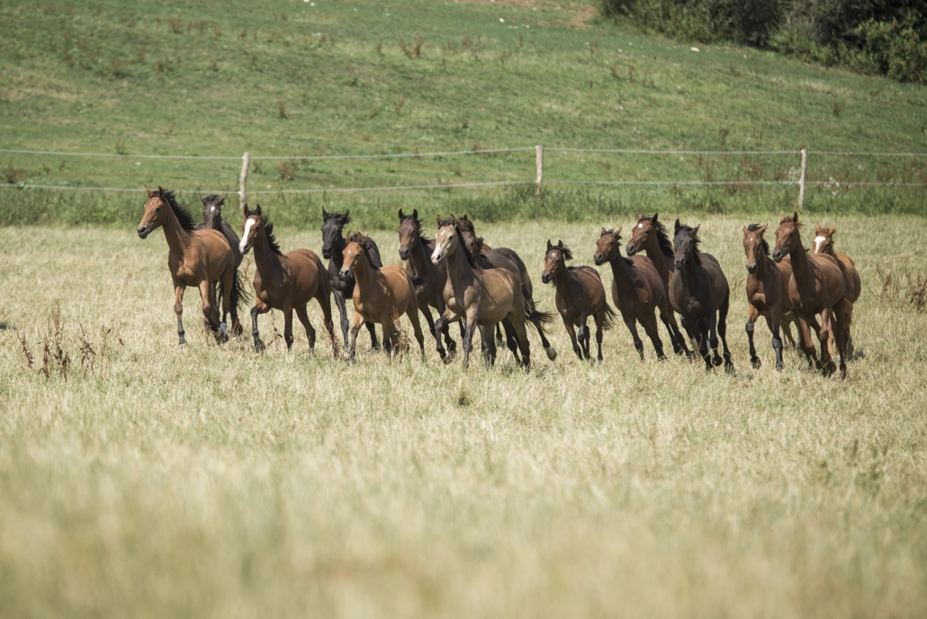 Die Fohlen werden in großen Gruppen von jeweils 15-20 Tieren gehalten. Im Winter sind die Fohlen in großen Laufställen untergebracht und werden täglich auf dem Sandplatz oder in der Halle bewegt. Wenn die Witterung es zulässt, dürfen die Pferde auch im Winter stundenweise auf die Weide. Im Winter werden sie mit Hafer, Maissilage, Gärheu, Heu und Mineralfutter gefüttert. Im Sommer stehen alle Tag und Nacht auf den 30ha Weideflächen, zusätzlich zum Gras wird Mineralfutter und Heu gereicht.